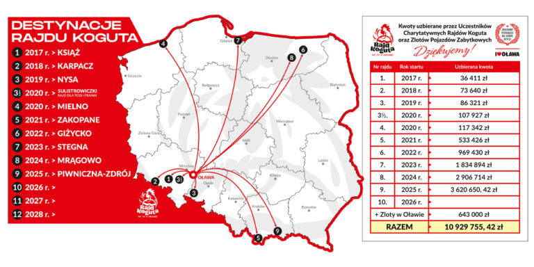 Rajd Koguta to dowód na to, że pasja i dobroć mają ogromną moc. Dziękujemy wszystkim uczestnikom, darczyńcom i partnerom, którzy razem z nami tworzą tę niesamowitą historię. Jeśli jeszcze nie wzięliście udziału, serdecznie zapraszamy – razem możemy osiągnąć jeszcze więcej!